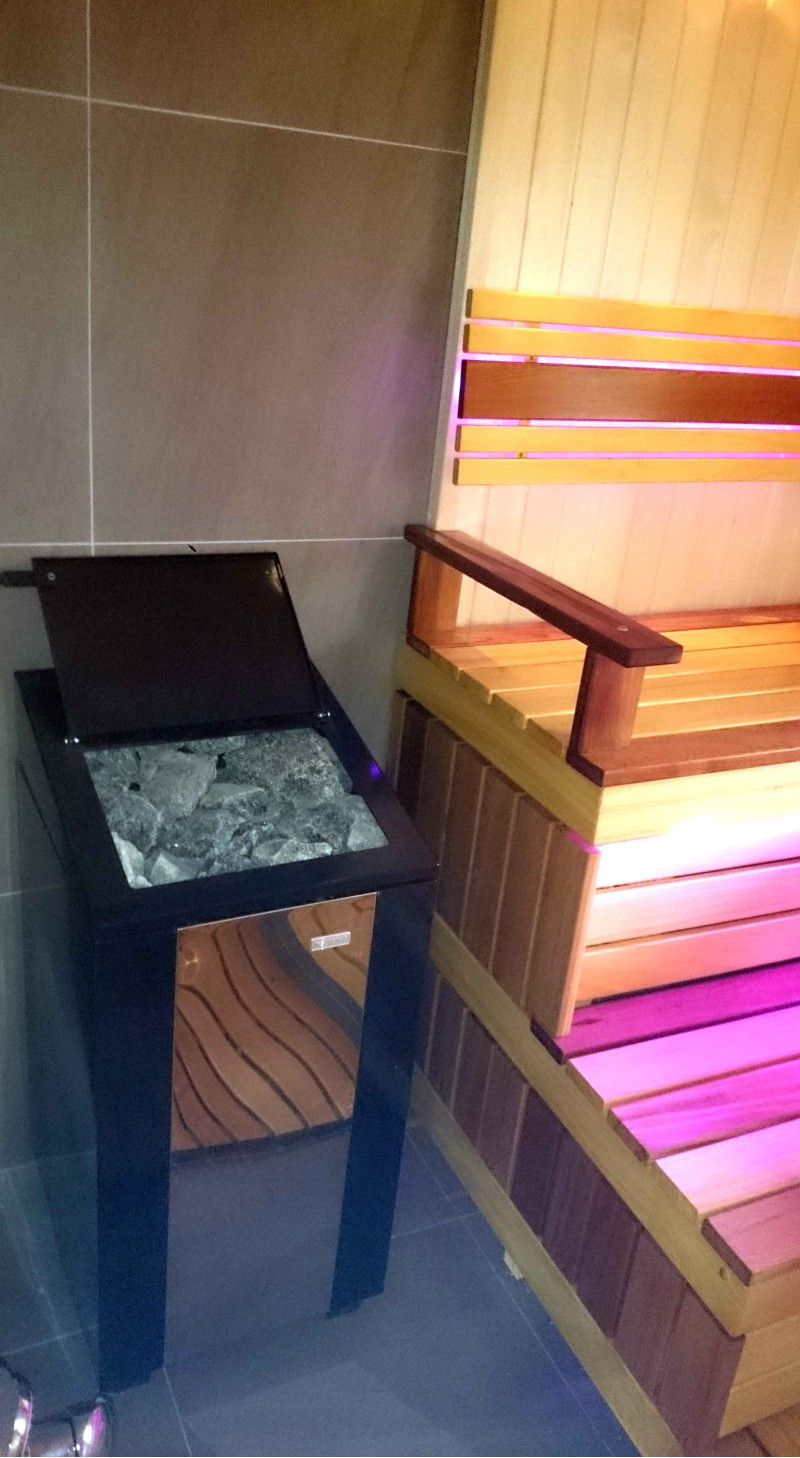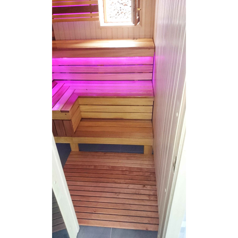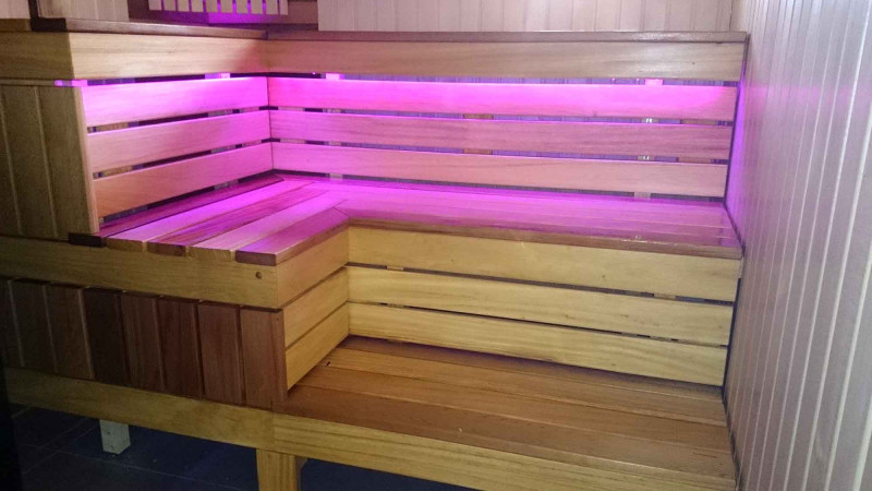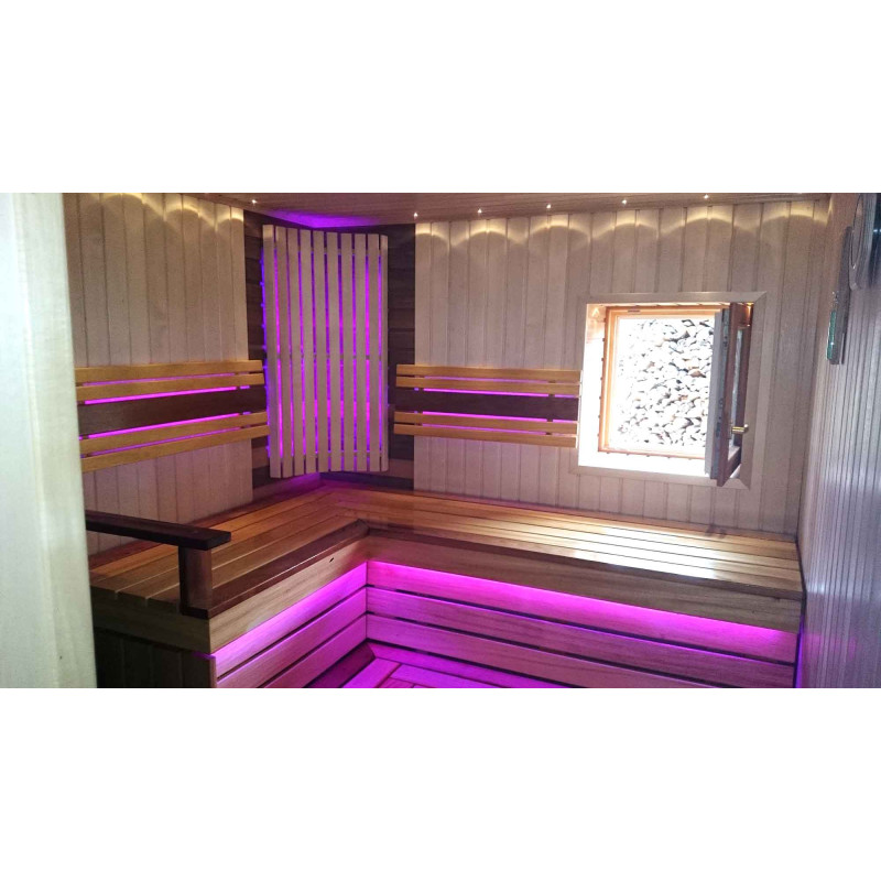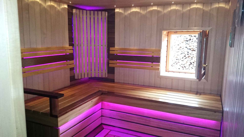 La sauna está equipada con un sistema de ventilación. La iluminación de colores se instala debajo de los bancos y detrás de los respaldos, creando un ambiente acogedor y relajante. Lámpara colgante Harvia con tapa de madera abachi. Termómetro e higrómetro Harvia, dos escalas.