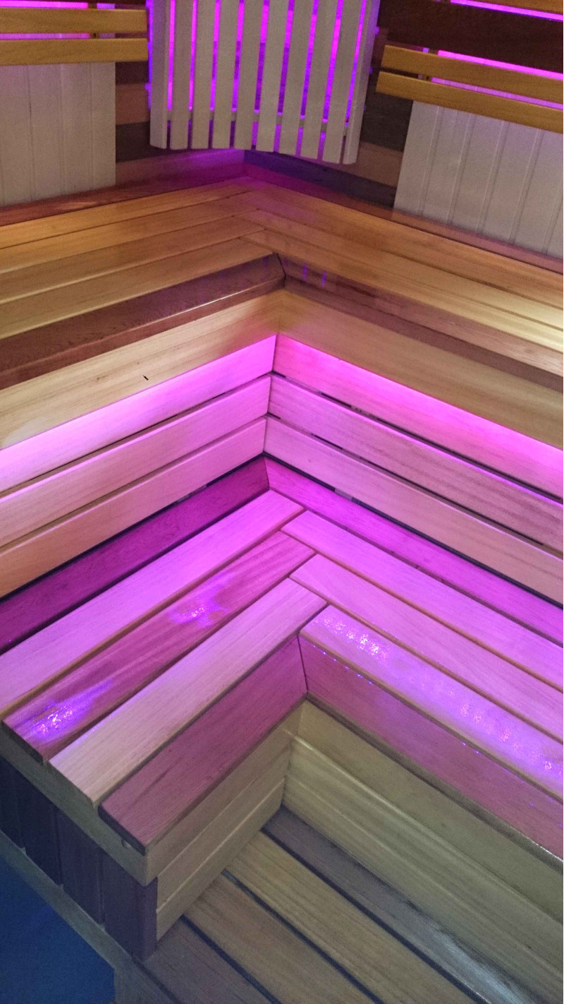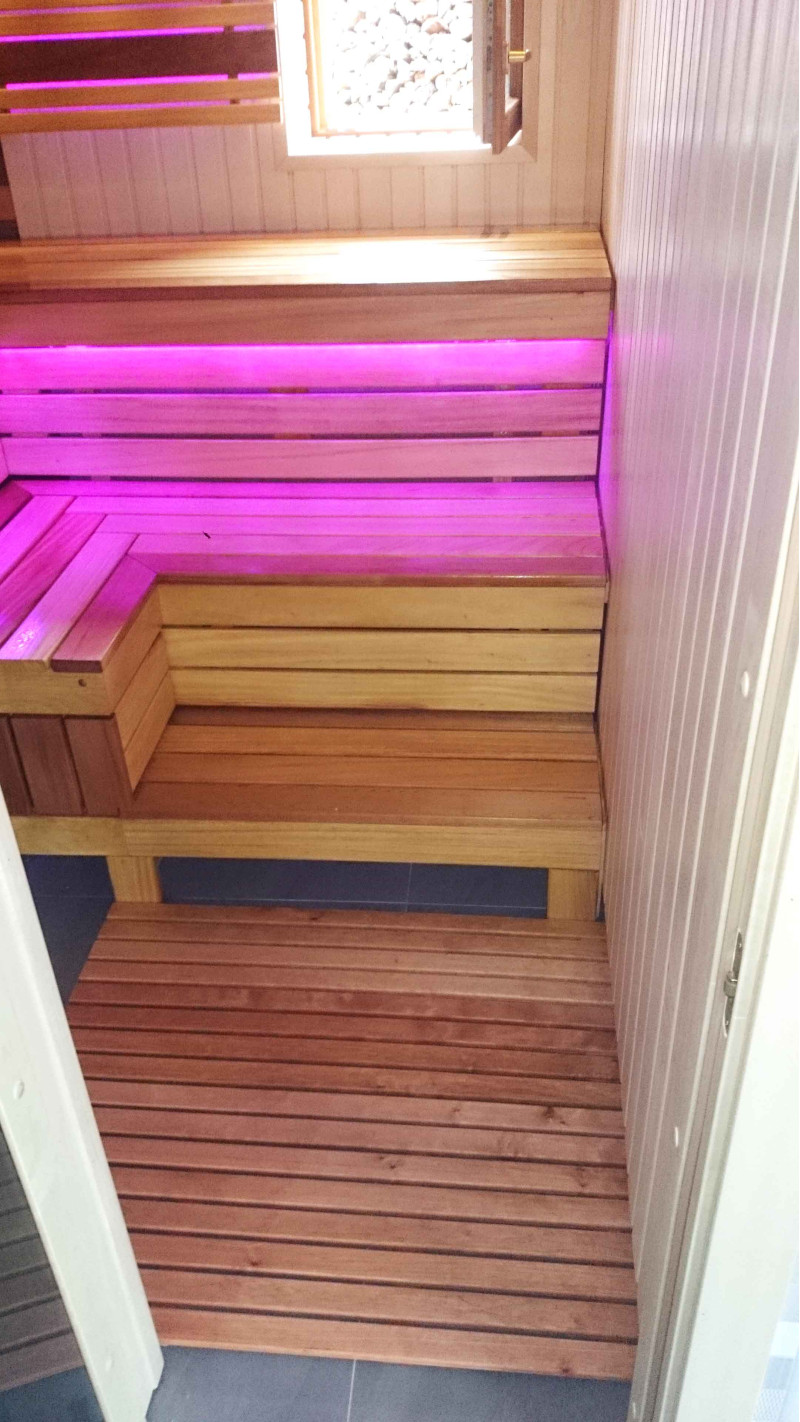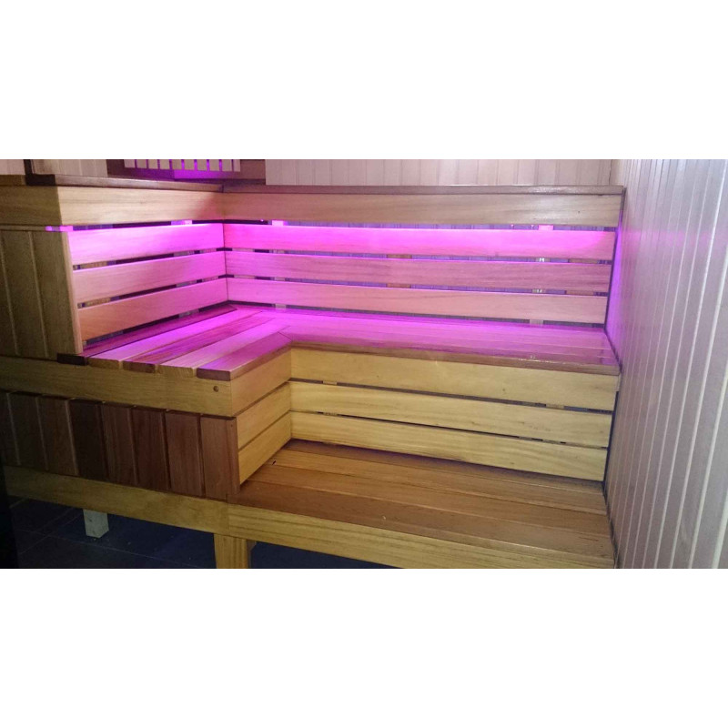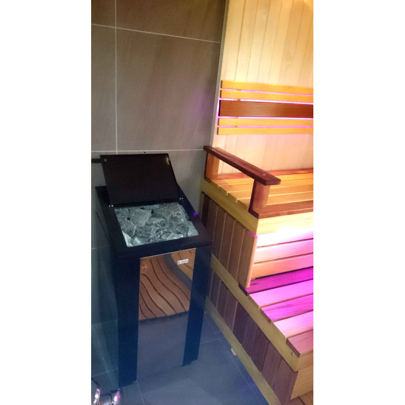 La sauna está equipada con un sistema de ventilación. La iluminación de colores se instala debajo de los bancos y detrás de los respaldos, creando un ambiente acogedor y relajante. Lámpara colgante Harvia con tapa de madera abachi. Termómetro e higrómetro Harvia, dos escalas.
