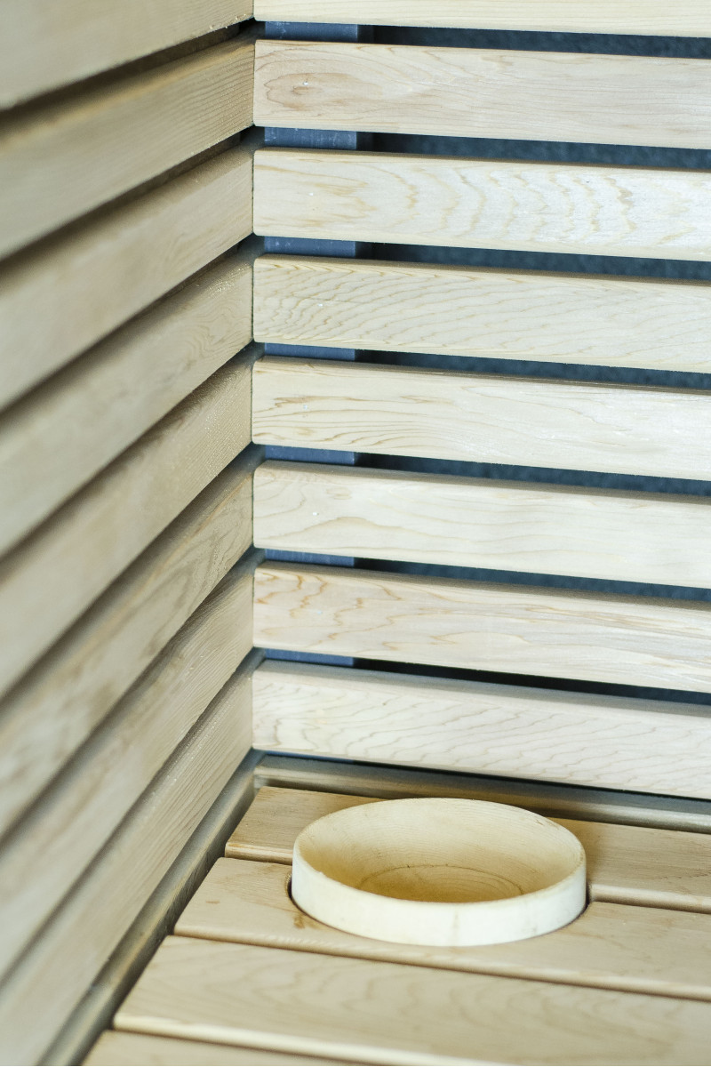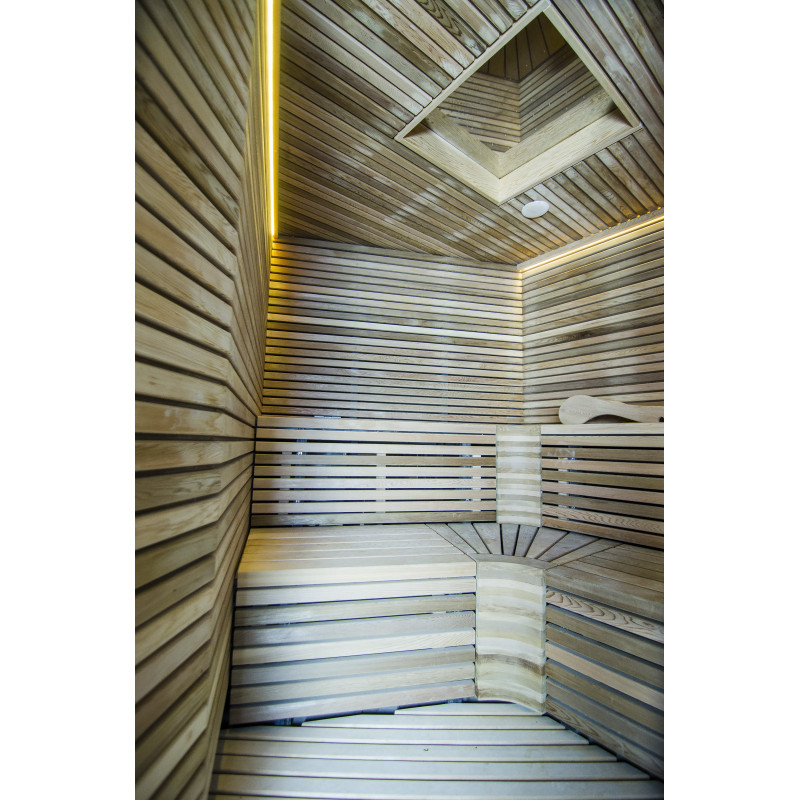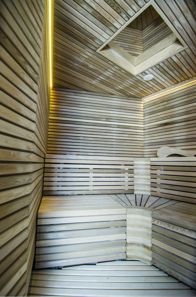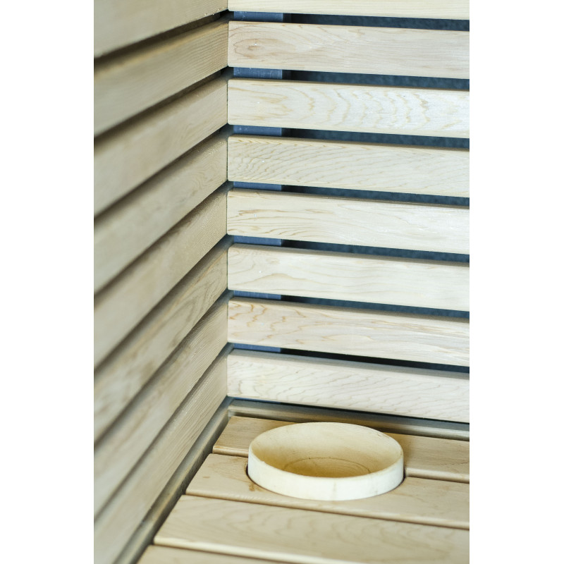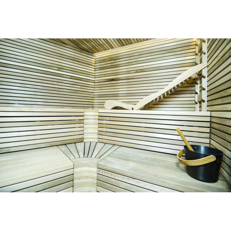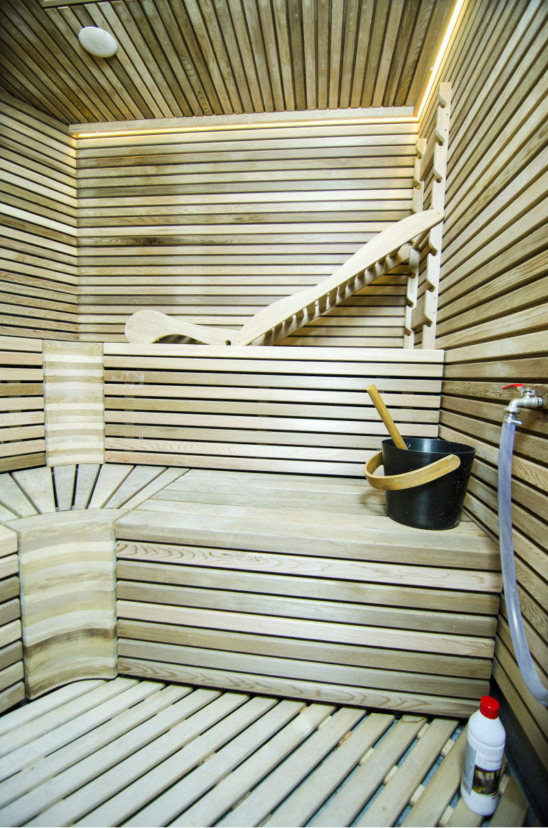 Las paredes y los bancos de la sauna están hechos de madera de cedro de la más alta calidad.
