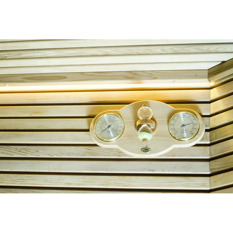 Accesorios de sauna: juego de cubo y cucharón, termómetro de madera con higrómetro y reloj de arena.