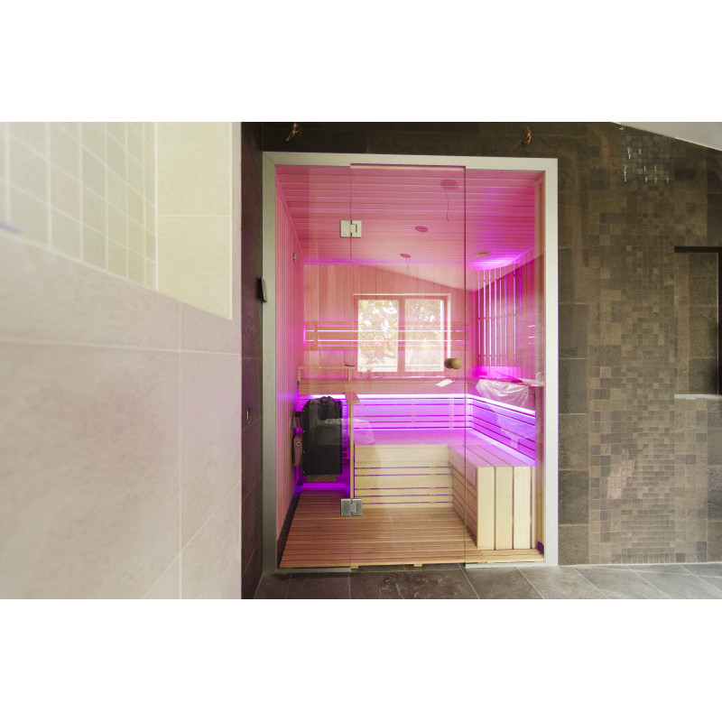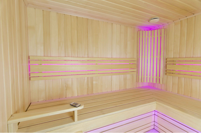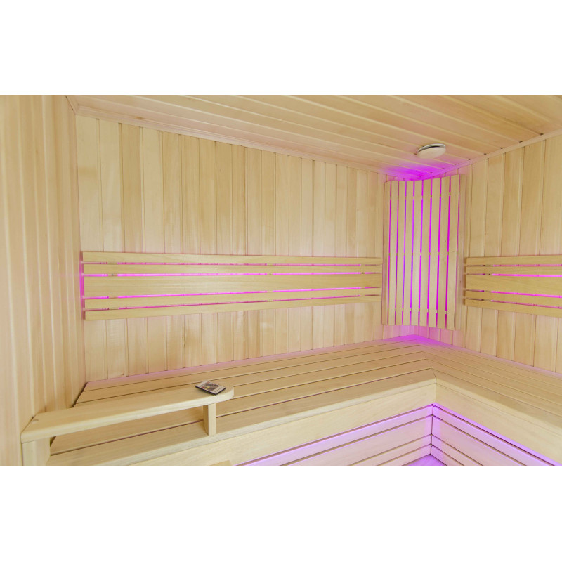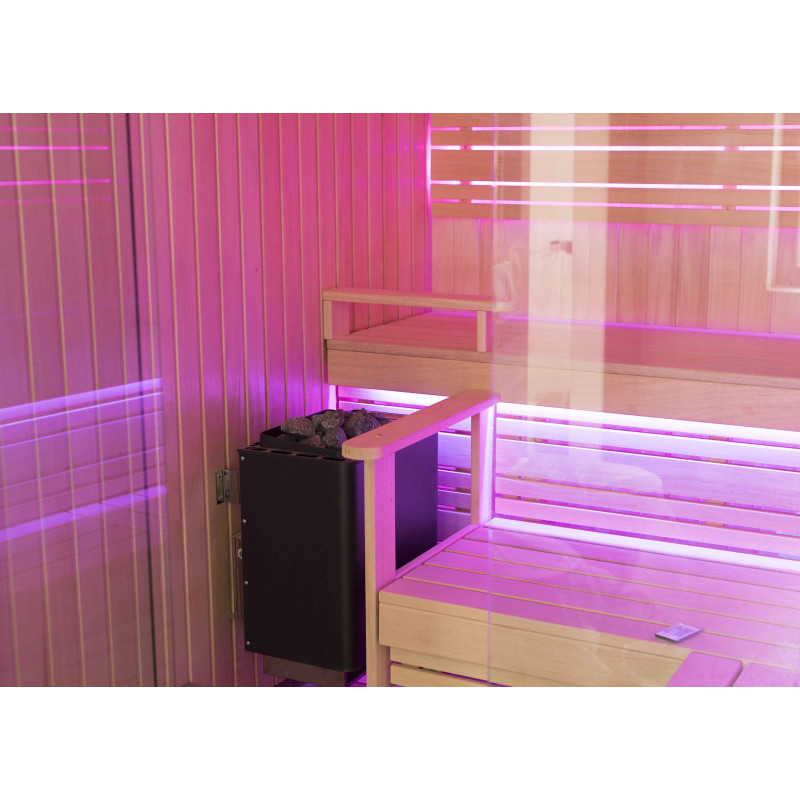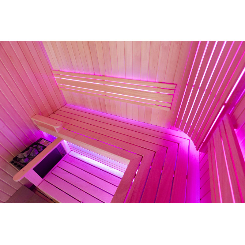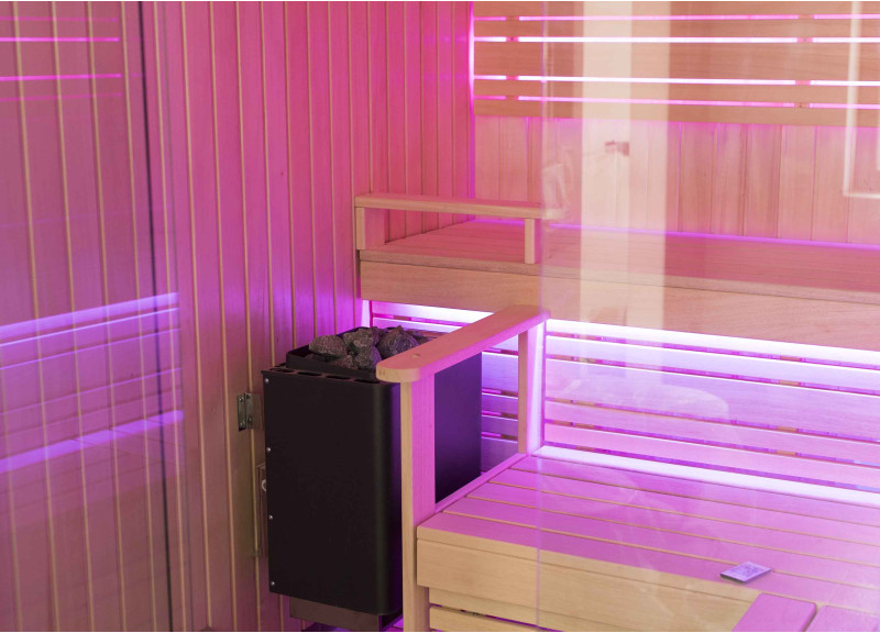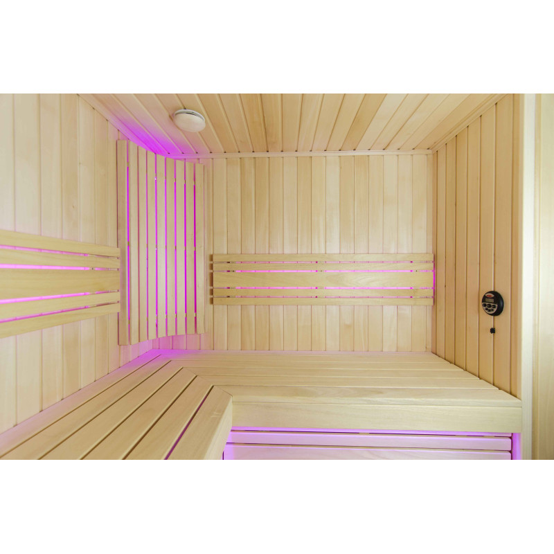 El interior de la sauna está hecho de madera de tilo de la más alta calidad, las tumbonas están hechas de madera de abachi, sin calefacción y perfectas para la sauna.