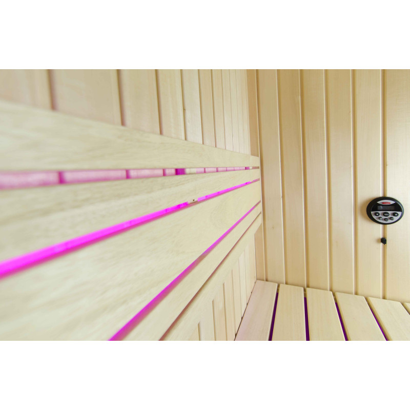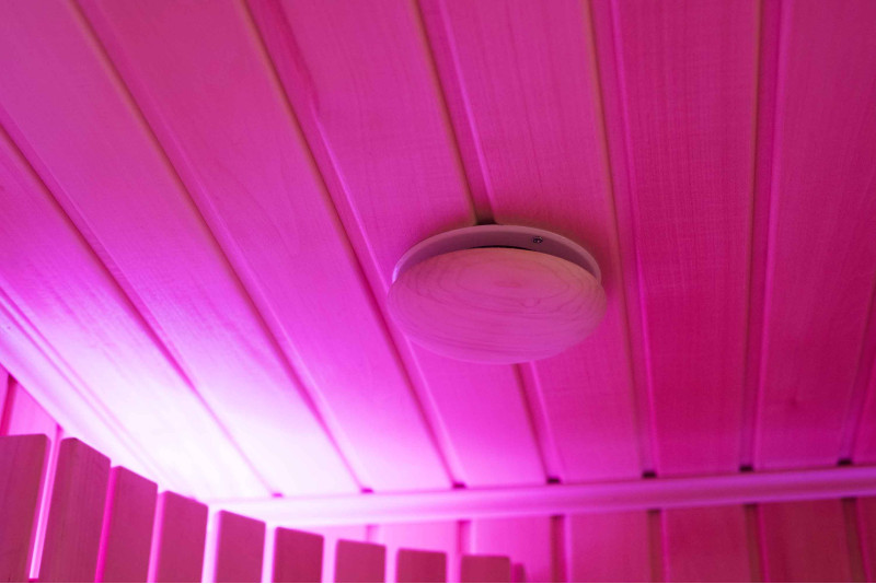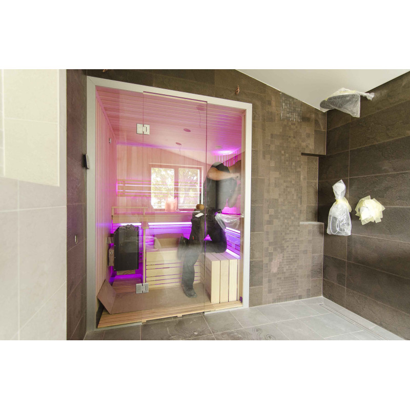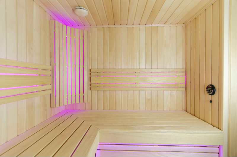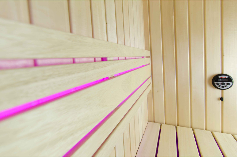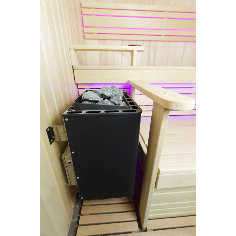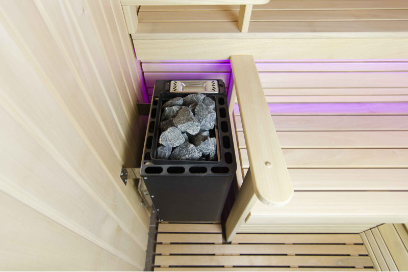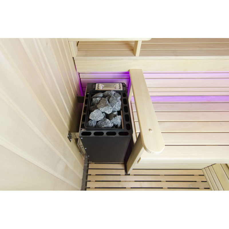 El interior de la sauna está hecho de madera de tilo de la más alta calidad, las tumbonas están hechas de madera de abachi, sin calefacción y perfectas para la sauna.