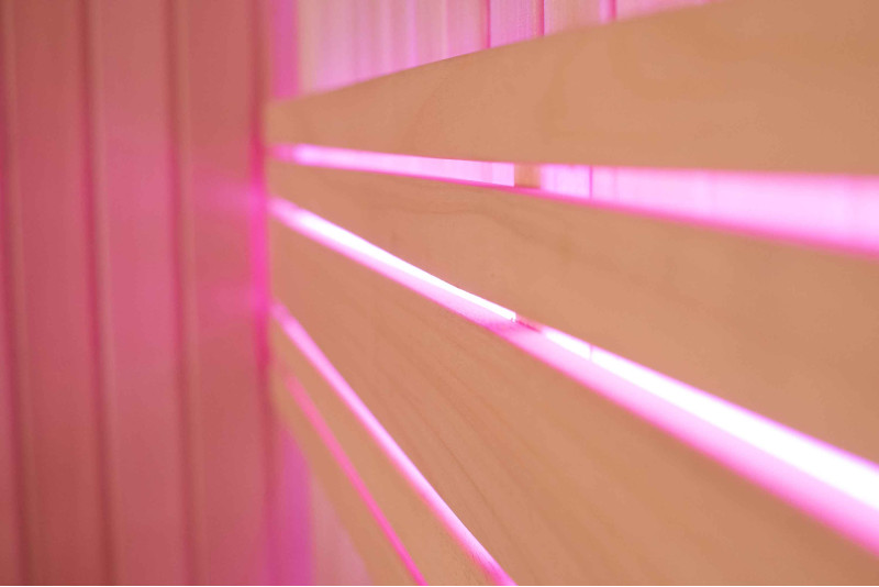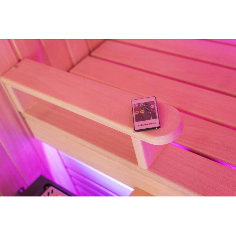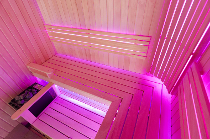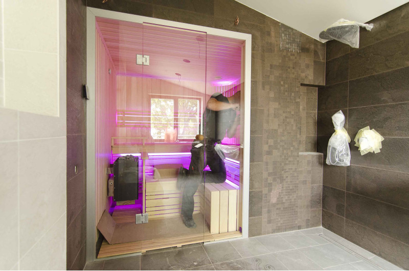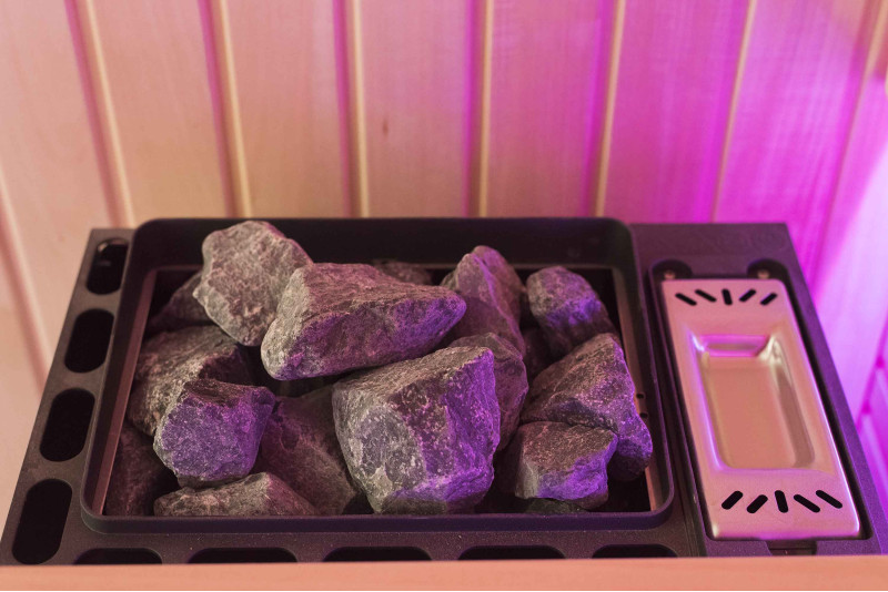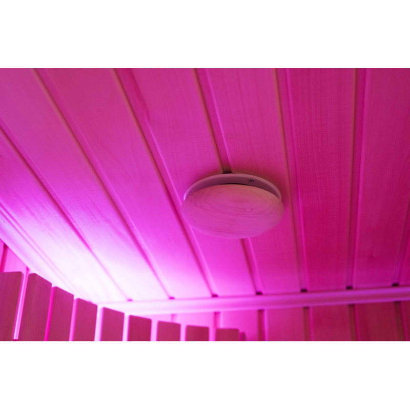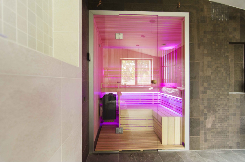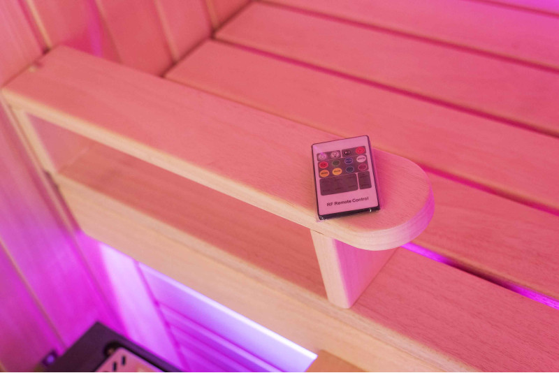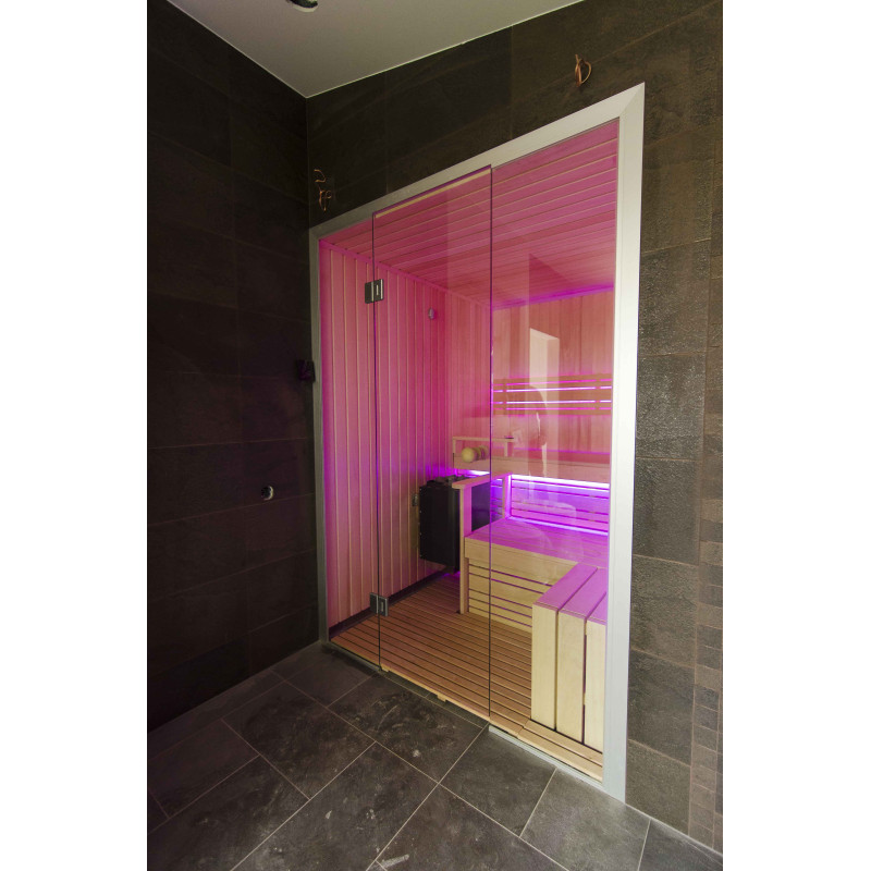 El interior de la sauna está hecho de madera de tilo de la más alta calidad, las tumbonas están hechas de madera de abachi, sin calefacción y perfectas para la sauna.