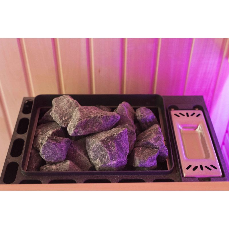 Modelo de calentador eléctrico - EOS Bi-O Thermat con generador de vapor. El calentador se cuelga en la pared y se controla mediante un panel de control separado: Harvia Xenio Combi.