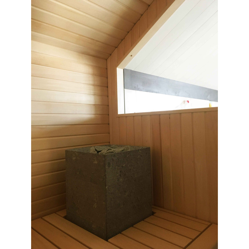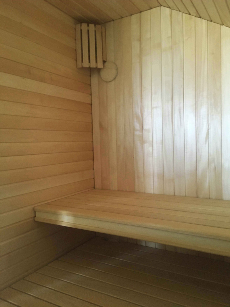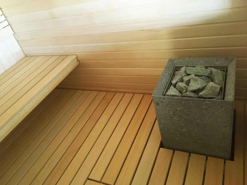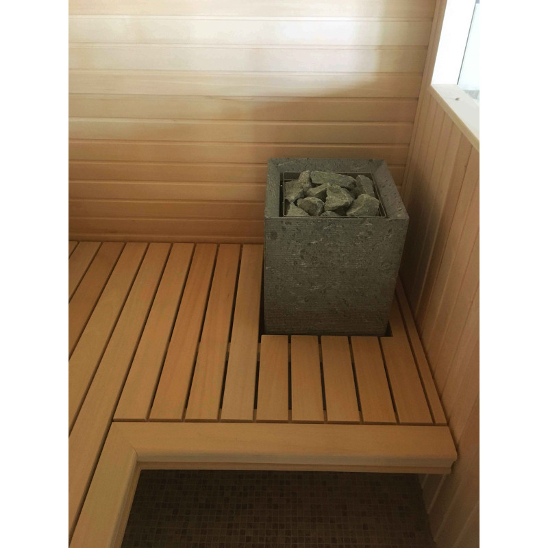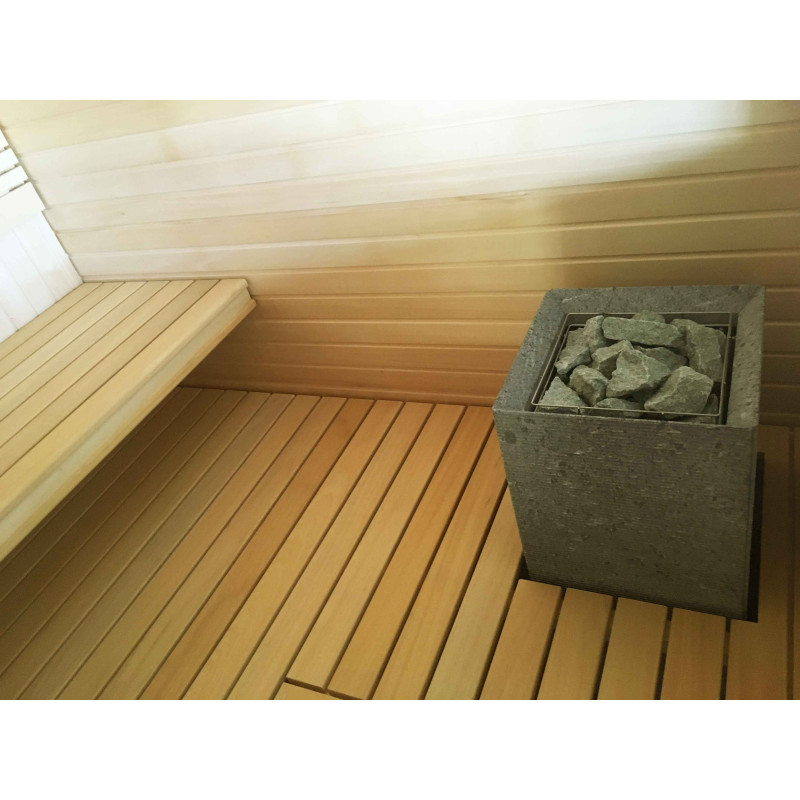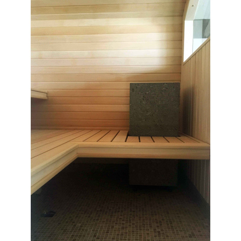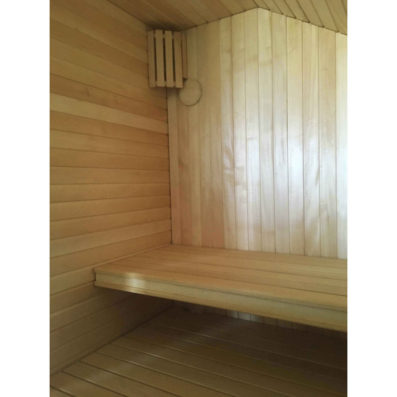 Las paredes y los techos de la sauna están hechos de madera de tilo. El revestimiento de tilo le da a la sauna más luz y emite un agradable olor a madera. Se eligieron paneles de madera de abachi de alta calidad para los bancos, los respaldos y la cerca alrededor del calentador. Esta madera blanda y sin calentar es una gran opción para bancos, soportes donde la madera toca la piel sin quemarla. Esto asegura comodidad y un gran descanso en la sauna. Los bancos, soportes y paredes están barnizados, totalmente preparados para un uso prolongado.