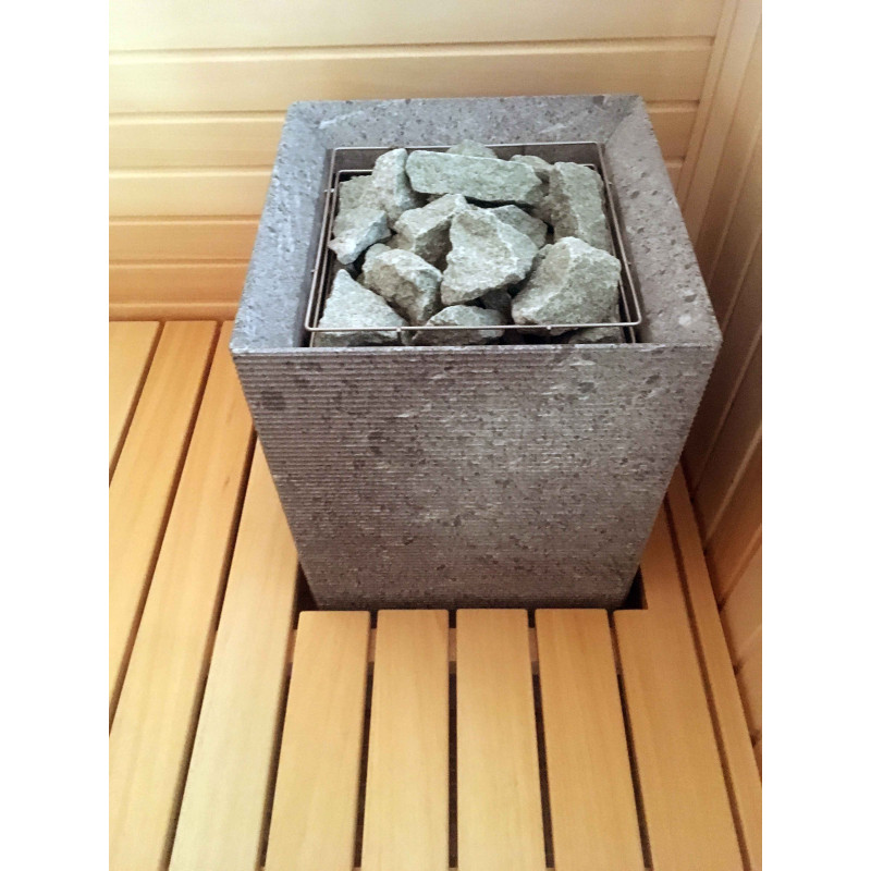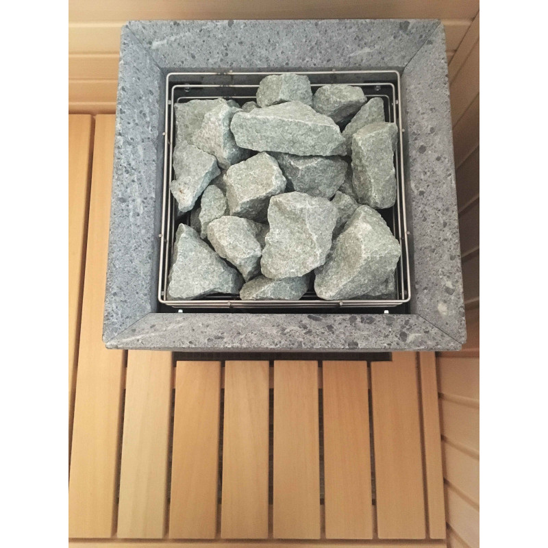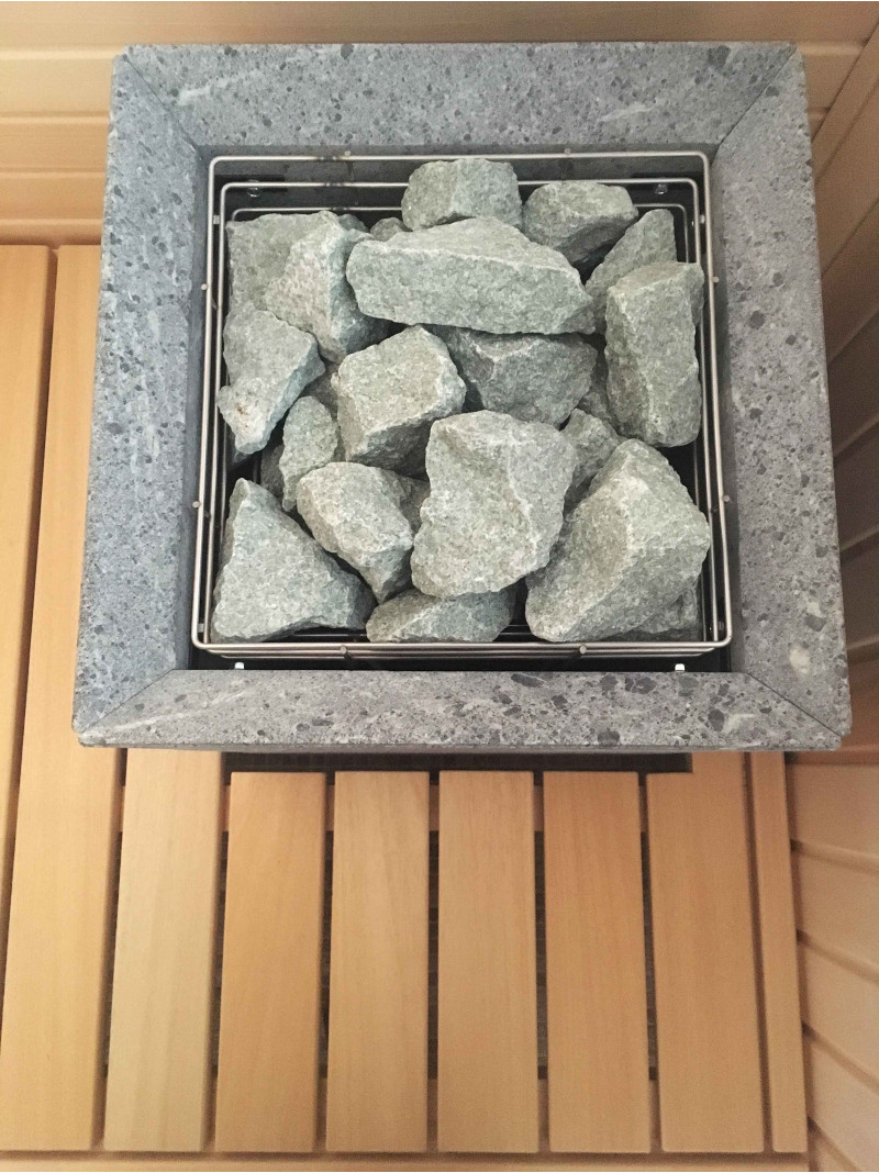 Calentador eléctrico Tulikivi Tuisku con acabado de esteatita. Controlado por control remoto. Lleno de una gran cantidad de una mezcla de diabasa de olivino y piedras de jadeíta. Debido a las distancias cortas de seguridad a las superficies inflamables y la superficie altamente no calefactora del calentador, esta es una buena opción para familias con niños y para integrar el calentador en bancos. La energía liberada por la jadeíta tiene poderes curativos para muchas enfermedades. Se mejoran las propiedades curativas de la jadeíta calentada. Al verter la piedra con agua se difunde un agradable olor a ambiente limpio en la sauna, lo que facilita la respiración.