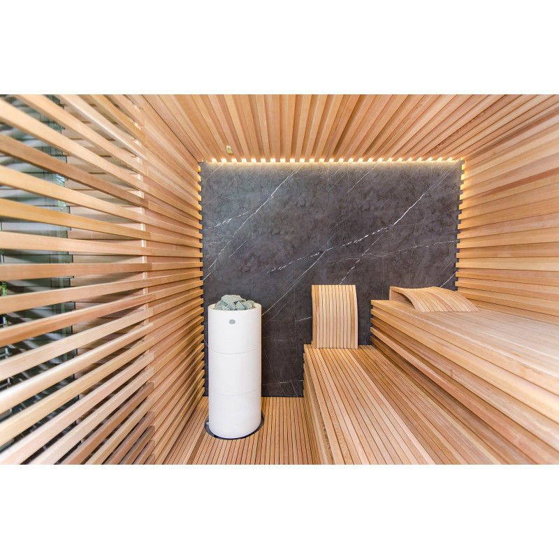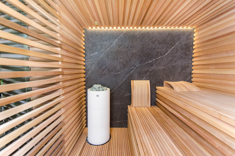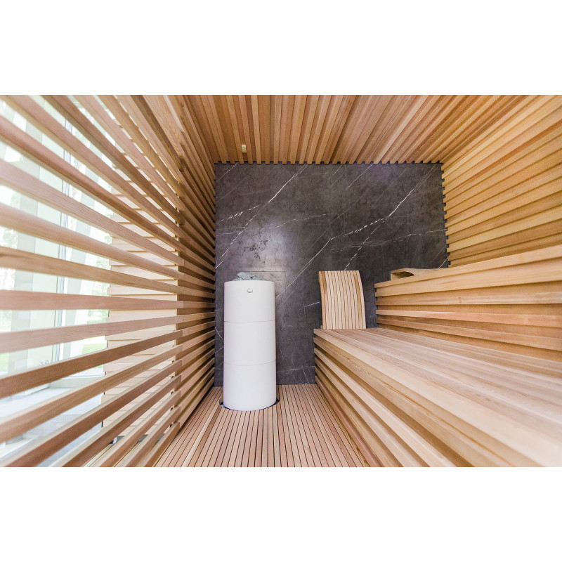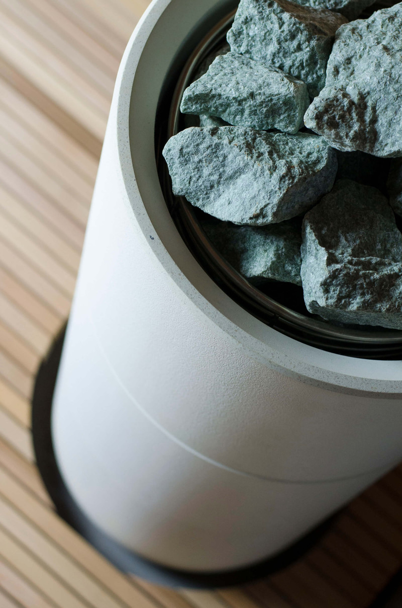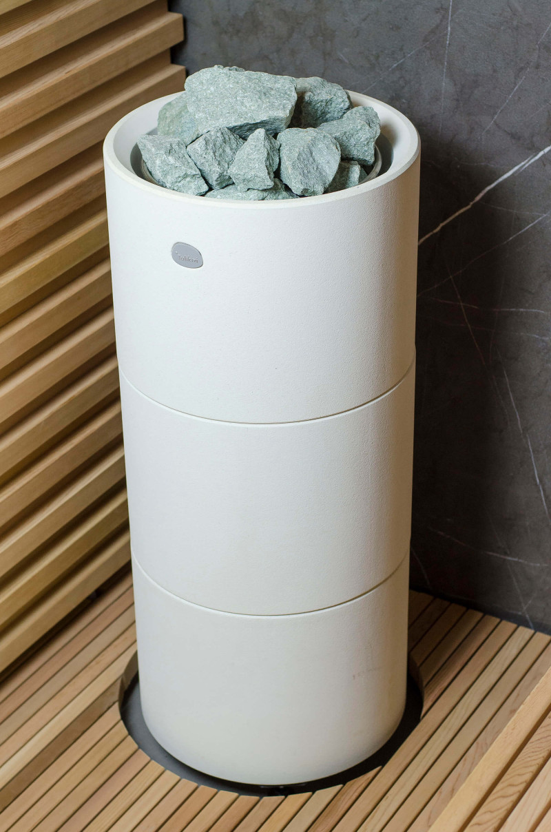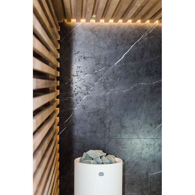 La fuente de calor es el calentador Tulikivi Kuura White, lleno de piedras de jadeíta. Cuando se calientan las piedras de jadeíta, se mejoran sus propiedades curativas. Verter agua sobre las piedras en la sauna difunde un agradable olor a ambiente limpio, lo que facilita la respiración. Se ha introducido una tubería de vapor en el calentador desde el generador de vapor de la sauna de vapor, lo que permite lograr una humedad mucho más alta en la sala de sauna. Esta es una excelente opción si no tiene las condiciones para instalar una sala de vapor y una sauna. Un sistema de control común es un gran monitor LED fijo. Todo el equipo también está controlado por un dispositivo inteligente desde cualquier parte del mundo.
