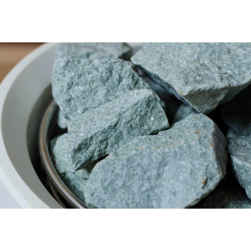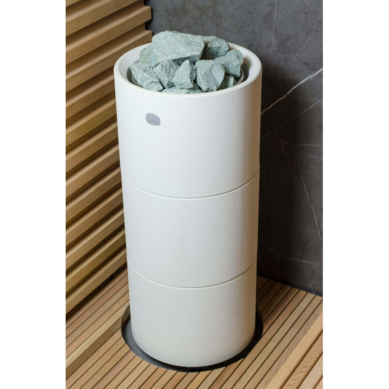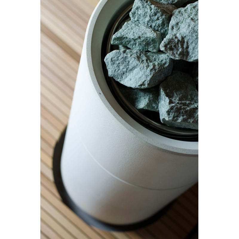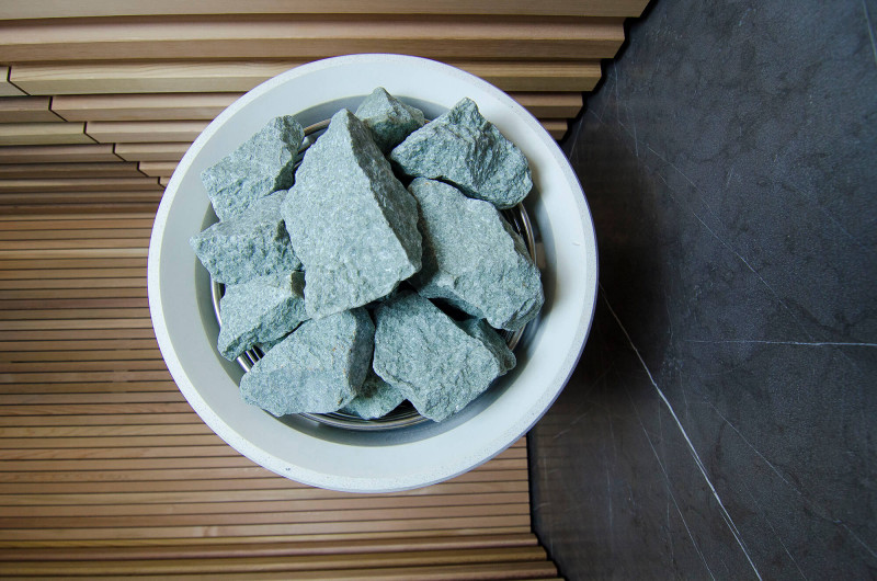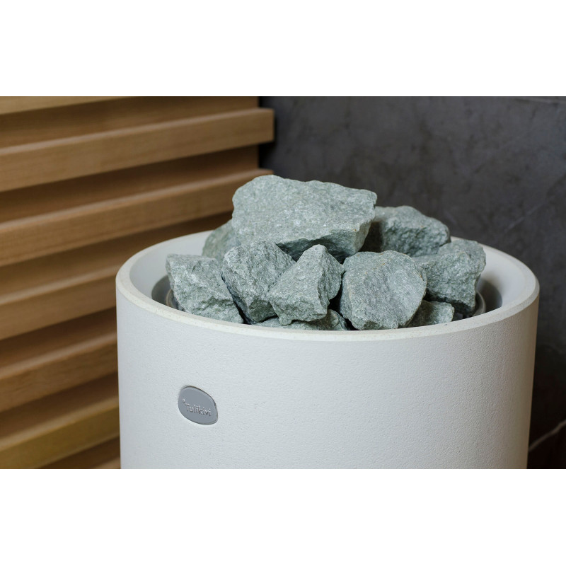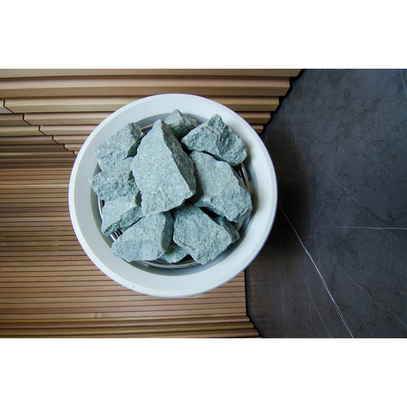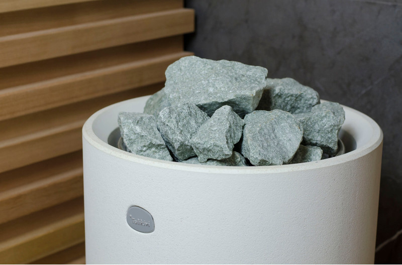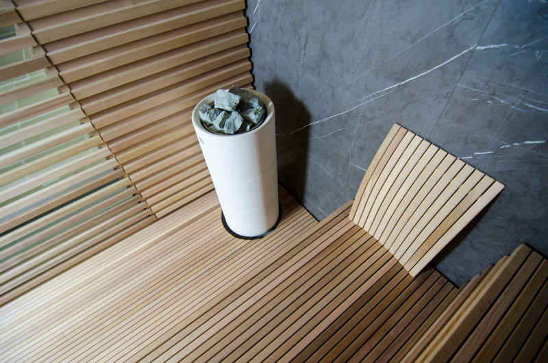 La fuente de calor es el calentador Tulikivi Kuura White, lleno de piedras de jadeíta. Cuando se calientan las piedras de jadeíta, se mejoran sus propiedades curativas. Verter agua sobre las piedras en la sauna difunde un agradable olor a ambiente limpio, lo que facilita la respiración. Se ha introducido una tubería de vapor en el calentador desde el generador de vapor de la sauna de vapor, lo que permite lograr una humedad mucho más alta en la sala de sauna. Esta es una excelente opción si no tiene las condiciones para instalar una sala de vapor y una sauna. Un sistema de control común es un gran monitor LED fijo. Todo el equipo también está controlado por un dispositivo inteligente desde cualquier parte del mundo.
