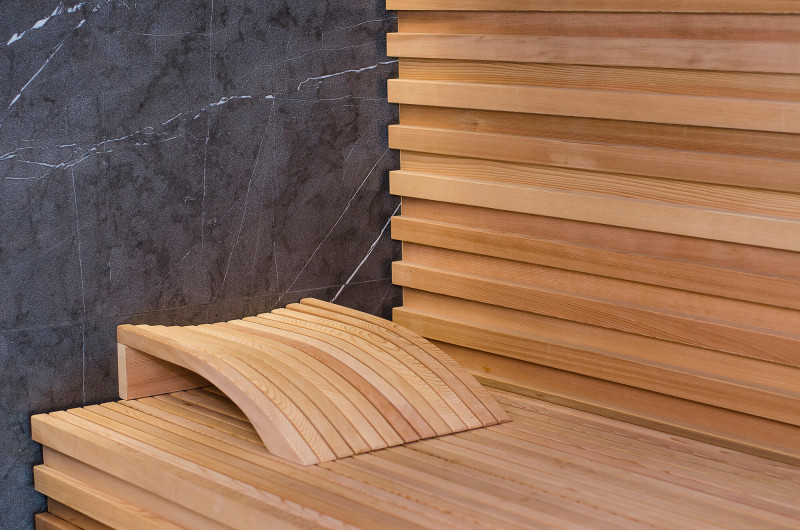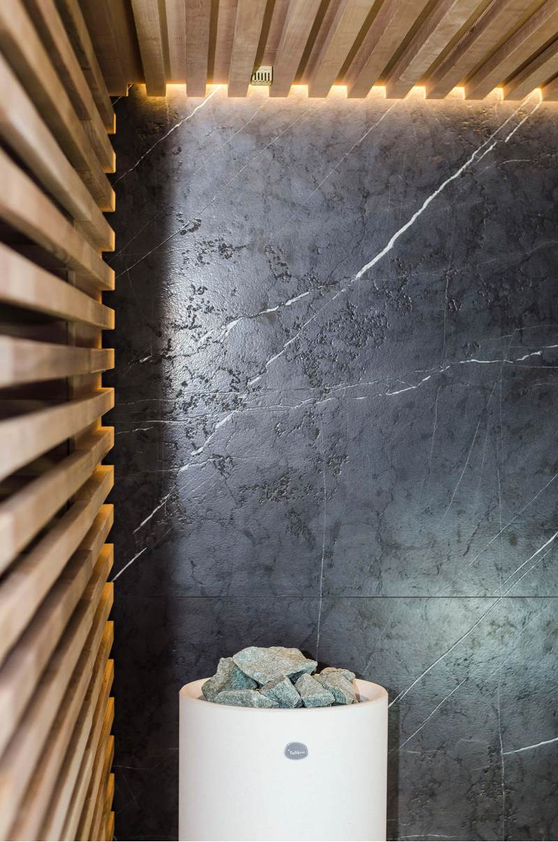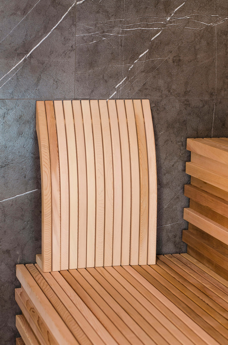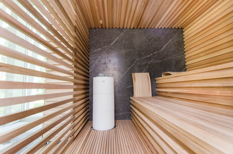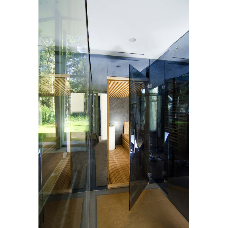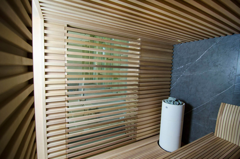 La decoración de la pared trasera de la sauna es de mármol italiano de diseño exclusivo, cuya belleza se acentúa con la iluminación LED instalada a su alrededor. La decoración de la pared lateral de la sauna es una ventana vitrina de vidrio, que se cubre con una rejilla calada extraíble. La sauna tiene vistas a la zona de spa, una gran zona de piscina. La iluminación de las paredes y el techo de la sauna es una tira de LED hermética de color blanco cálido. Puertas de vidrio sin marco.