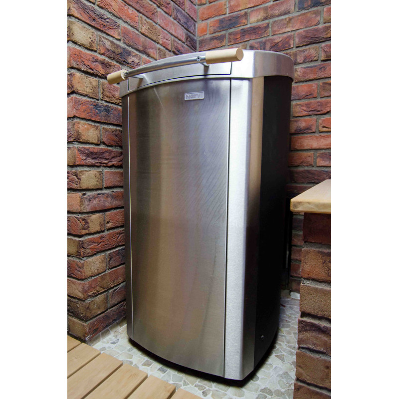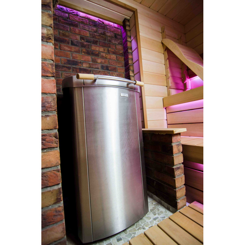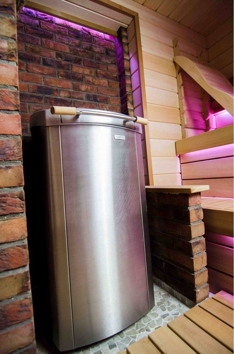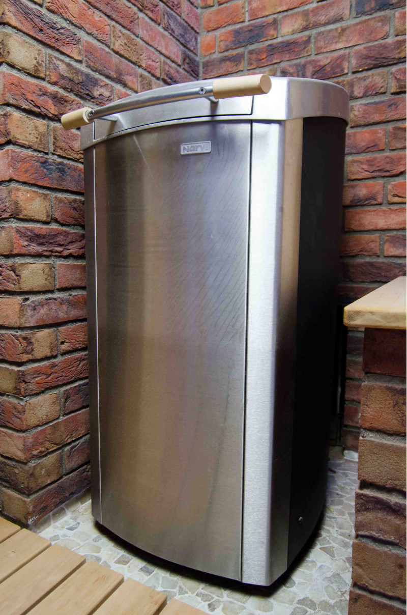 El calentador tiene un diseño moderno y minimalista: Narvi Steam Master Royal con chimenea externa. Apto para uso intensivo, da mucho vapor. La campana está cerrada durante la calefacción. El calor se almacena en una gran cantidad de piedras (80 kg) debajo de la campana sin sobrecalentar la sauna y sin secar el aire. Se vierte agua sobre las piedras abriendo la tapa. El calentador asegura un calor uniforme y húmedo.