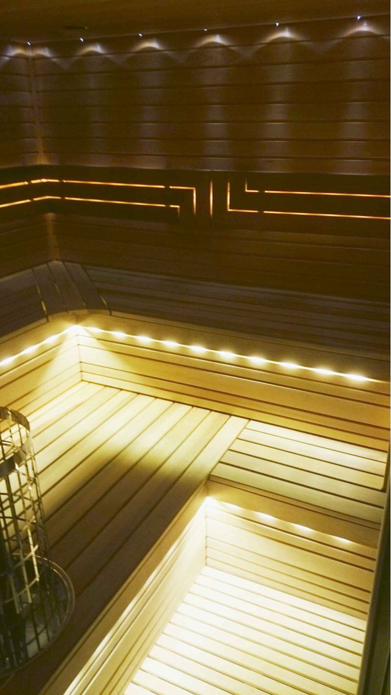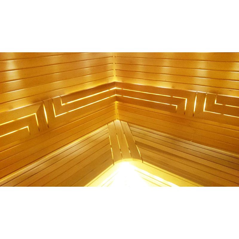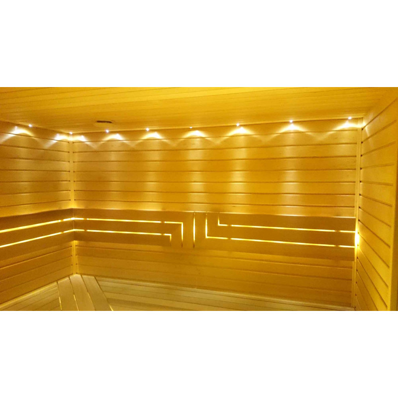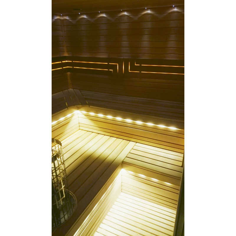 El techo está equipado con iluminación LED exclusiva "Sol", las tiras de iluminación LED están instaladas debajo de los bancos y respaldos, color blanco cálido. Gracias a la iluminación, se proporciona parte del efecto relajante de la sauna.